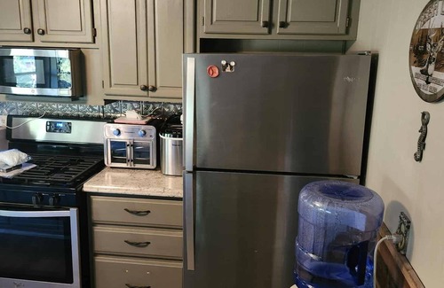 The cabin is quite cozy and rustic. It features a bedroom with a comfy full size bed, a cozy living room with a day bed that can sleep 2 , and all the essentials like a washing machine, coffee maker, hair dryer, heating, and AC. The bathroom has a shower only. While drinking water is supplied, the water from the faucets is non-potable. You will have access to an 850 gallon tank of water for non consumable use. In the event that you use more than this during your stay, you will need to contact the owner to replenish at a fee of $100.
