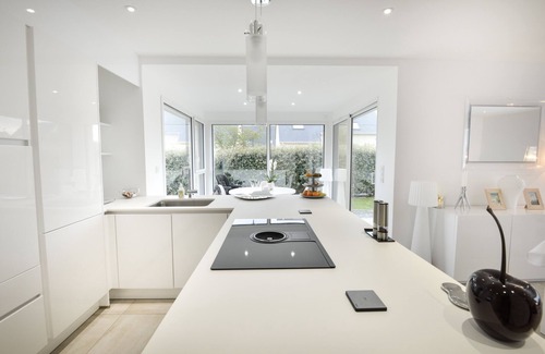 - An open-plan kitchen with appliances including oven, microwave, toaster, dishwasher, hob, etc.