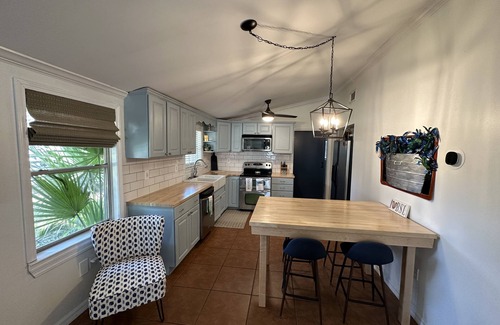 After your adventures, you could choose to stay home and sip coffee on the comfy couch, while reading a book and looking through the window at the old oak trees. Our simple and functional kitchen features plenty of counter space, as well as a counter height custom made dining room table. A convenient upgraded sink and countertop design and a complete offering of dishes, plates, pots, pans and utensils makes it easy to order in or whip up a dinner at home.