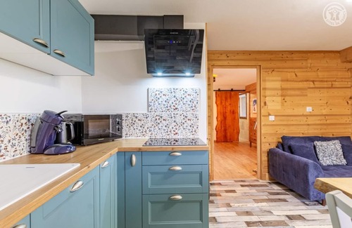 Ground floor apartment, on the ground floor of the owners' home. On one level (5 steps down from the car park then path through the grounds to access the gîte): Living room-kitchen area with access to the private outdoor dining area, 1 bedroom (2 single beds 90x200 cm which can be twinned into 1 double bed 180x200 cm + 1 single sofa bed 74x200 cm for a child), shower room (shower + toilet), private parking (1 space). Unfenced grounds shared with the owners. On the ground floor of a traditional house located 13km from the funicular linking the slopes of the Les Arcs/Paradiski area. Decorated with a warm mountain feel, in a very quiet residential area bathed in sunshine. Private outdoor space and large grounds. Magnificent panorama of the surrounding peaks and the opposite slope (La Plagne, Les Arcs). Ski Granier 9km, Montalbert/la Plagne/Paradiski 20km, la Plagne/Paradiski 27km. Lake 11km away.