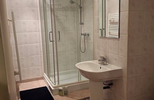 Bedroom 1, on the ground floor, has a large double bed and one single bed. There is an ensuite shower room with WC and basin.