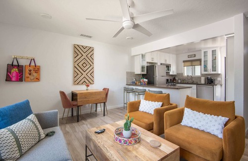 The “Ponto” Leucadia Bungalow is the ideal place to unwind and escape to the beautiful coast. The kitchen is fully stocked with all the essentials, plus some special treats for coffee enthusiasts like a K-cup Personal Coffee Maker, a French press, a bean grinder, and a Nespresso Mini for a quick morning pick-me-up. To make your stay even more enjoyable, we’ve included a BBQ grill just off the kitchen, a private, fully fenced-in backyard with lush grass complete with patio furniture. Additionally, there is an individual enclosed laundry room with a stacked washer and dryer. Both bedrooms are equipped with comfortable Casper mattresses, and the primary bedroom features a king-size bed and a flat-screen smart TV. The guest room has a queen-size bed, and the main living space includes a queen sofa sleeper (available on request for a small fee). All laundry, bathroom, and kitchen amenities are included. Electric car charging available onsite for an additional hourly fee.