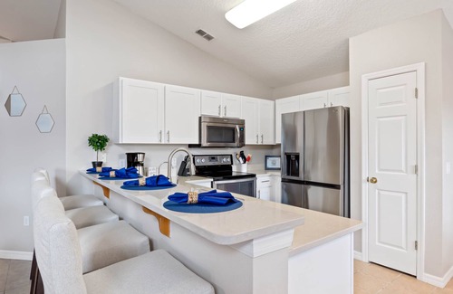 Welcome! Come inside and let the vacation begin! The large sliding glass door and back wall windows invite in ample natural light and provide a clear view of the private pool. There’s plenty of room for the entire family to watch a program in the living room or gather around for a board game. And the fully-equipped kitchen is ready for all your culinary needs.
