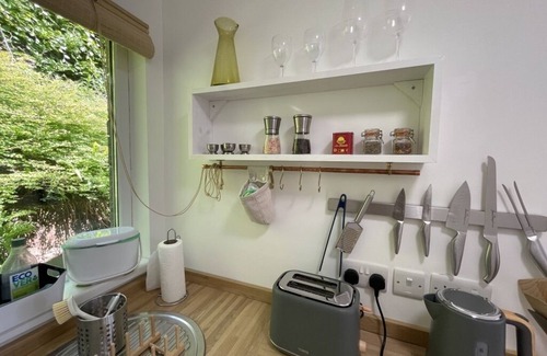 The light and airy living area is furnished in gorgeous natural materials with an armchair and comfy sofa bed (we can also provide mattress toppers on request for an even more luxurious sleep). There are maps, guidebooks and games on the bookshelves. The tv is set up with amazon prime and Netflix. To the other side is a thoughtfully designed dining snug, comfortably seating at least four, with soft cushions.. a perfect place to enjoy a meal, play games or simply put your feet up and enjoy the views and everchanging skies over Exmoor. The living area opens onto the thoughtfully designed kitchen which is well equipped with an oven, grill, ceramic hob, fridge microwave, cafetière, hand blender and all the pots, pans, plates, bowls and cutlery you could need with a window onto the bird-filled Devon wall and hedging. We also provide local teas and coffee and there is olive oil, salt and pepper and sugar for your use.