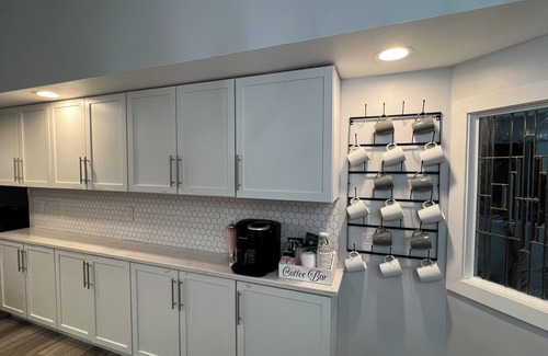 The kitchen is fully stocked with the usual suspects--electric oven, glass stove (5) top burners, side by side refrigerator, dishwasher, microwave. We have some fun items--an ice maker and a designated coffee/tea/hot cocoa area--coffee pot/single serve, stove top kettle, electric tea kettle, along with various sweeteners, non-dairy creamers, coffees and teas. We have included various barware, platters for your entertaining needs. The kitchen eating area can seat (4) and the dining room area has tables and benches to seat approximately 14 more.