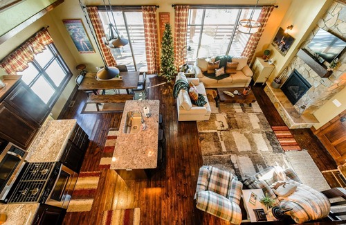 Open Concept Living Space: Features a fully-equipped kitchen, large dining table that seats 10, breakfast bar with additional seating for 3, and numerous picture windows that make the space bright & open feeling. A large TV is mounted above the fireplace and there are two couches & two chairs. This is a great space for everyone to gather.
