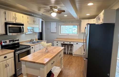 Great floor plan with large tiled foyer/entry, a kitchen layout that accommodates not only the chef in the family but the critics too. The house has many updates including stainless steel appliances. Large dining room with a three seasons porch off the back. It has a spacious master suite overlooking the lake, with a king bed and full bath. The second bedroom has a queen bed and the third bedroom has two sets up bunk beds. The outdoor patio has an eight person table and Adirondack chairs will be on shore. Two kayaks as well!! All kitchen, bed, and bath linens provided.