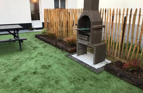 1 bathroom of about 6 m2 with 1 vanity unit, wc, heated towel rail, washing machine, walk-in shower of 0. 90 cm x 1. 40 cm. A living room of approximately 26 m2 including a kitchen equipped with microwave, oven, dishwasher, toaster, kettle, ceramic hob .. a living room, a 80 cm flat screen TV and a large storage cabinet (table and iron, vacuum cleaner) all in a modern style. The garden includes garden table-parasol-sunbathing and barbecue