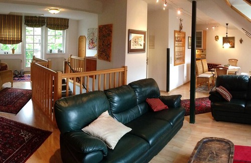 The spacious "Loft" apartment is located above the roofs of Bad Vöslau. A historic stone staircase leads to the spacious living room with its library. The loft is ideal for larger families who appreciate enough space. In addition to the large living and dining room there are 2 double rooms and 2 single rooms. There are two bathrooms, each with a shower. In one bathroom there is a toilet, the second toilet is separate. In addition, you will find a washing machine and a dryer in one of the two bathrooms. The kitchen is full and well equipped. In the kitchen there is an electric cooker with an oven, microwave, dishwasher, refrigerator and separate freezer, coffee machine, kettle, toaster and a small bake. Ironing board and iron are available. Free WiFi, car parking in front of the house.