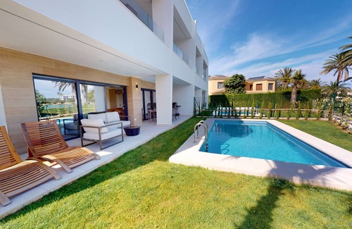 Appartment with open views of the golf course. This exquisite three-bedroom home has been designed with maximum comfort and convenience for its occupants in mind, offering a single-level layout with a fully equipped open kitchen that will delight gastronomy lovers.