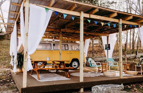 Disconnect, relax and enjoy!! WOW, what a find! This Vintage Good Vibes VW Camper Van is only 45 mins from St. Louis, MO, located on 200 acres of private land. We welcome guests to connect with nature and enjoy all the fun things the property has to offer. Private lake swimming/fishing, private access to the Meramec River, hiking trails, and so much more! The Camper Van offers comfortable amenities, such as AC and heat, cozy furnishings, and a lovely queen mattress.