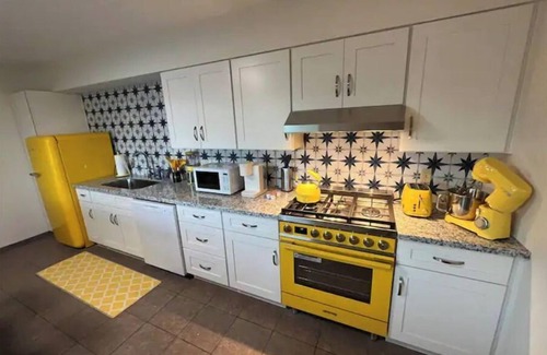 Inside the home, you'll find the living room with a fireplace and a 50" Samsung Smart TV, two sofas (long enough to sleep on; they do not fold out into beds), and a club chair. The oversized eat-in kitchen is well equipped with cookware, new 2022 appliances, and a dining table with seating for six.