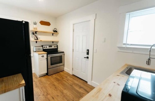 The house has a living room with 50" TV and Roku/Wifi, spacious dinning room with seating for four, stylish kitchen with open shelves, and 1 beautiful bathroom with tile in shower and floor, and 1-bedroom with queen bed upstairs.