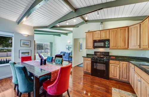 Escape from your busy city life and find yourself at this unique and very peaceful getaway set on 11 acres of private forest land with access to a creek, ponds, and a hiking trail out to views of the Pacific Ocean and Havens Neck Island. The property consists of three private suites, all with desirable amenities and all with private entrances. Relax in the beautifully appointed and decorated rooms boasting art from well-known local artists, prepare full-course meals in the kitchens and kitchenettes, enjoy a soak in the outdoor hot tub in the redwood forest setting, or just close your eyes and listen to the sounds of the creek below and the barking sea lions in the distance. These homes also feature smart, Direct TV-equipped flatscreen TVs with over 55 paid movie channels for when you just want to watch a movie at home.
