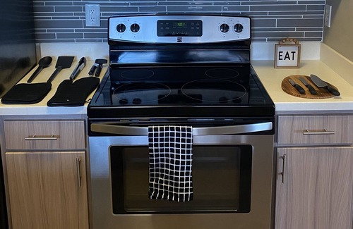Turn on the fireplace while you watch a movie on a brand new 55 inch Samsung crystal 4K tv loaded with Netflix, Amazon Prime, Samsung tv, YouTube and more. The kitchen comes fully equipped with everything to host a dinner for guests. The unit has a washer and dryer, 2 spacious closets, ceiling fan and dedicated workspace. After a long night you’ll have a good night sleep on a queen size Serta mattress.