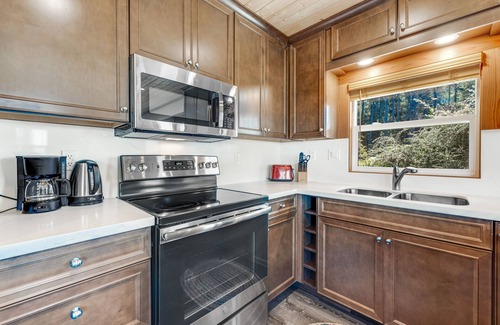 Located about 150 yards from a private highway entry gate and set back on one acre, this comfortable, recently renovated, lower-level vacation rental is ideal for a magical getaway for two. This clean and modern cottage will put a smile on your face the moment you step through the door - prepare for a lovely view out the windows and the sound of crashing waves. Prepare anything from quick beach snacks to full-course meals in the well-equipped kitchen, dine together at the adjacent table for four, or step out into the yard surrounded by well-trimmed eucalyptus tress to enjoy the blue and white ocean view. Listen to the barking sea lions, watch for visiting wildlife, and catch the sunset! This home also features an electric flame fireplace in the master bedroom to set the mood on those chilly nights.
