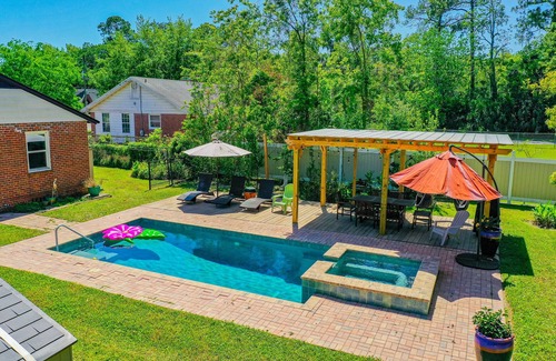 Discover your private oasis in the heart of Jacksonville’s charming San Marco neighborhood. This stylish 1950s home blends vintage charm with modern comforts—featuring a heated pool, hot tub, grill, and space for up to 8 guests. Whether you’re planning a family vacation, a weekend escape, or a long-term stay, everything you need for a relaxing getaway is right here.