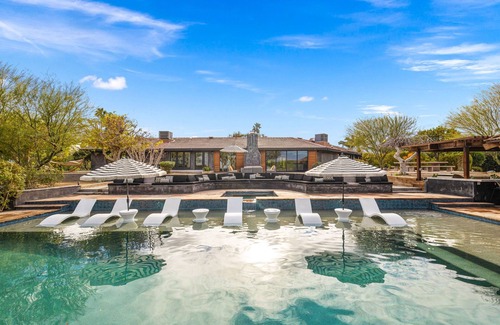 Ultimate luxury awaits at this expansive, 5-acre vacation home located in the heart of the desert. The property consists of a main house, a detached casita, and a sprawling outdoor area with a private pool, hot tub, lake, sports courts, and stunning mountain views. The home sits just minutes from famous outdoor music venues.