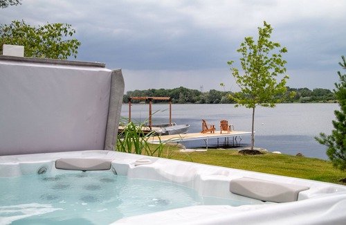 Luxe Lodge is a chic retreat. Waterfront on the Trent River, this stylish cottage was featured on HGTV’s Renovation Resort Season 1. The cottage sleeps 8 guests in 3 bedrooms and a flex loft space. This tech forward lodge features a private hot tub and dock. Luxe Lodge is on a private road with 6 other cabins that share a beach and fire pit. Luxe Lodge is available for booking all year.