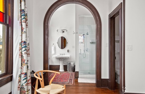 The Columbian Heights room is located in the Ludlow House of Summit Street Inns. It once belonged to Mrs. Ludlow and is a second-floor beauty with historically inspired décor and gorgeous stained glass windows that offer a view of Summit Street, St. Paul’s Episcopal Church and 5th Street. The stunning carved archway that leads into the bathroom is original to the home. The room offers carefully renovated accommodations with a comfortable, king-size bed, desk and private bathroom with sizable walk-in shower.