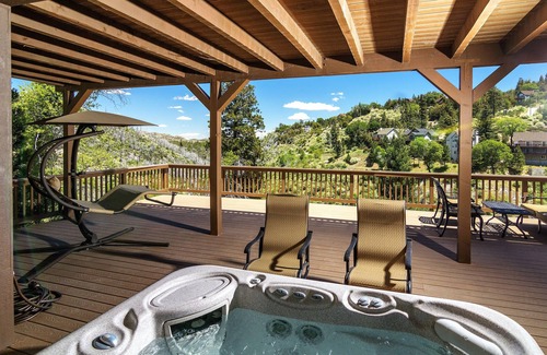 Find your escape in our luxurious mountain cabin featuring vaulted ceilings, a fully-stocked chef's kitchen with a Viking stove, two master suites, 8-person jacuzzi, dual AC/heater systems, immaculate views, and so much more.