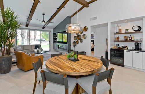 Walk into a property that is designed and remodeled worthy of architectural magazines. This property features high-end finishes, wooden ceiling beams, new kitchen, new floors and new furniture. The kitchen features new appliances, gorgeous countertops, and new cabinets. The kitchen is stocked with everything you need for meal prep. Relax on the large sectional sofa with your family or friends. Enjoy your favorite movie or game on the 65in. Smart TV. Cozy up with your loved ones and enjoy the electric fire feature in the living room. The rustic dining table features seating for six. Make your favorite cocktail at the built-in bar. The property features new full size washer and dryer.