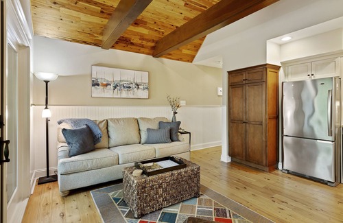 The bedroom features a king-sized bed and the living room also contains a sleeper sofa for an extra guest. The bathroom has been updated with a walk-in shower, new fixtures, a granite-topped vanity, tile floors, and beadboard paneling. For added convenience, a washer and dryer are located in the walk-in closet.