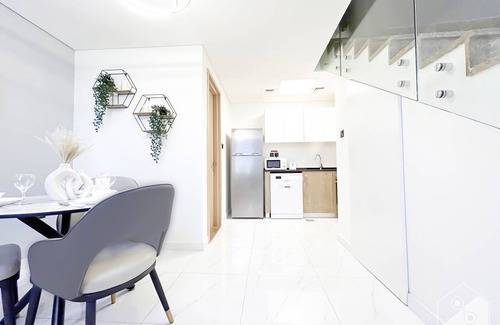 The space features a stylishly furnished living room, a fully equipped kitchen with modern appliances, and a comfortable bedroom with a king-sized bed. The villa also includes a private balcony with stunning views of the surrounding area, perfect for relaxing after a long day of exploring the city.