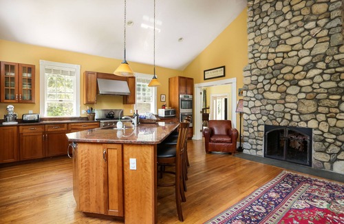 The kitchen features a large island with granite counters, a Viking stovetop, high-end stainless appliances and a Country French farm table which comfortably seats a large group.