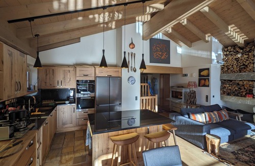 The house is built over three floors. The front door opens to the entrance hall or a side-door leads to the ski room with heated boot rack and separate WC. Off the entrance hall is a cosy corner bench and table area used either for separate dining or for games. The hallway then leads to a grand open plan living-kitchen-dining room with its enormous vaulted ceiling, long farmhouse dining table, fully fitted high-end kitchen, deep sofas, open fireplace and grand piano. This room overlooks the lake and the ski slopes beyond with views down the valley. Full width glass doors open to an extra deep balcony with a further dining table, chairs and sun lounger.