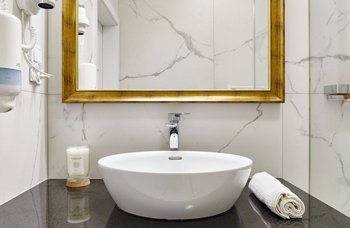 Bathroom with walk-in shower, hairdryer, and premium toiletries