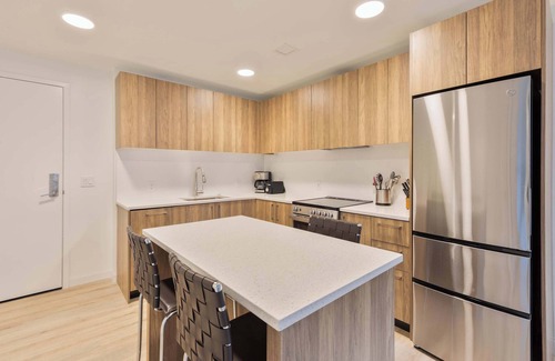 These sleek spaces feature stainless steel appliances, quartz countertops, and ample soft-close cabinetry. Select units boast floor-to-ceiling bay windows and private balconies.