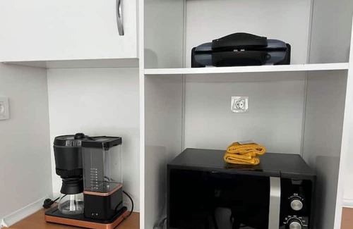 The kitchen is fully equipped. A refrigerator, stove, range hood, microwave, kettle, coffee maker, cups, citrus press, blender, pots and pans, cutlery, and all other necessities are available.