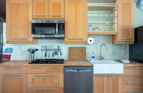 An open floor plan provides a common living area with an 1880's Harvest Table, efficient kitchen, and comfortable living room all pulled together by a Danish wood-burning stove. The kitchen includes a gas cooktop, vented microwave, full-size electric oven, toaster oven, stainless appliances, a refrigerator, and fully stocked cabinets with cookware and dinner ware. The coffee bar includes a drip coffee maker, Kuerig, and French press. This kitchen has everything you need to cook and serve dinner at a table that seats 8 to 10 friends and family.