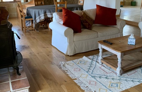 Going through the spacious kitchen . going through two livings rooms with ample of space to relax and eat on the dining table for 6/8 persons , But if it is cold the fire place and hot air conditioning will keep you warm and relax .