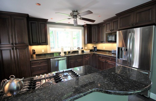 Gorgeous house in Rockport, steps to beach, town, train, Shalin Liu performance center! This home is located on a quiet side street, surrounded by beautiful flowers and shady trees, overlooking Mill Brook. Stroll to Front Beach in 5 minutes, or to the shops and restaurants of Bearskin Neck in less than 10 minutes. Step aboard and enjoy the home's Nautical ship theme. The fully equipped gourmet kitchen (the Galley) opens to an atrium-ceiling eating area with bar-height table and eight chairs. The living quarters feature a 50” flat-screen TV, leather couch and chairs, and a game corner with table and 6 chairs. Enjoy the built-in cabinet full of books, games and puzzles for all ages! The luxurious 3rd floor master suite - otherwise known as the Captain's Quarters - features a king bed and a spa-like bathroom with double sinks, soaking tub, and oversized shower with rain-head. Three additional bedrooms include the Admiral's quarters (1 queen), the Skipper's quarters (1 full bed with twin trundle), and the Pirate's Den, with it's stunning wall mural and set of 2 bunk beds (4 twins). Beautiful outdoor space includes 2 patios, gas grill, and outdoor games. Bonus room in the garage houses a ping-pong table, beach cart, beach chairs, umbrella, sand toys & cooler. Two and one-half bathrooms (full bath both second and third floor, half bath on first floor). Also includes washer/dryer, air-conditioning, and off-street parking for 3 cars!. Come enjoy everything Cape Ann has to offer while enjoying luxury accommodations.