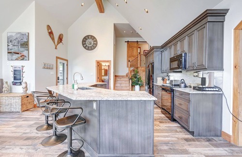 Inside, enjoy open-concept living with heated floors, modern finishes, and classic cottage charm. The kitchen is fully stocked with appliances, cookware, spices, coffee, and tea. Share meals at the large farmhouse dining table or relax by the fireplace with an 85” Smart TV and lake views.