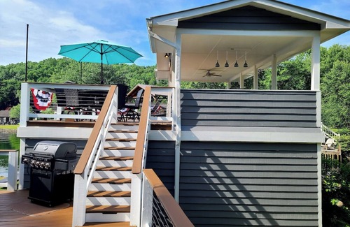 Charming waterfront bungalow on beautiful and prestigious Lake Burton in North Georgia. Two I Master bedrooms on Main floor with king beds with waterfront view and private bathrooms. Each of these Master bedrooms have an attached private sleeping room with a twin trundle bed that sleeps two. Third Master bedroom on second level with waterfront view with king bed and twin trundle bed that sleeps two. All new furnishings throughout the house with all the comforts of home including well equipped kitchen. Satellite TV, Smart TV’s and Wi-Fi internet connection are available. Gas burning fireplace in the Family room and electric fireplaces in each bedroom for cozy nights indoors or gather around the fire-pit outside. Boathouse with covered and exposed deck for sunbathing and outdoor dining. Swimming and fishing right off of dock. Playroom with ping pong, indoor shuffleboard table, pac man, TV. Outdoor basketball goal and level yard for children's play. Boathouse has extra slip for rental boat if desired (rentals available at two marinas on the lake--La Prade's and Anchorage, each about a 12 minute ride by boat.)