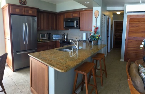Each of the two bedrooms has a king size bed, a ceiling fan, a large closet, and plenty of storage. The windows in the bedrooms have plantation shutters and face the mountains, allowing you to sleep easy as the trade winds sweep through the unit. Two twin size floor mattresses and a portable crib/playpen are available for children and babies. Both bathrooms feature large marble showers, spacious vanities and sinks, and bamboo theme faucets and hardware. The kitchen was fully remodeled in 2012 and has solid cherry plantation style cabinets and granite counter tops. It is fully equipped with all new top of the line KitchenAid appliances. A Cuisinart blender, coffeemaker, toaster, top quality pots and pans, and numerous gadgets make your culinary adventures enjoyable. The Kuhio Shores BBQ area has two high quality propane barbecues with barbeque utensils conveniently located for your use. Then bring your food inside and dine at the glass and rattan table surrounded by the ocean. Seating is available for two more at the bar.