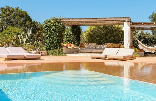 You can reach the villa by a private drive through olive groves and meadows. The house is situated on a hill and offers a wide view of the landscape overgrown with olive trees and the gentle breeze that softens the summer sun. Like an oasis surrounded by exotic gardens, the pool is like a lake that almost reaches the villa's doors. The house was designed for outdoor living, with an outdoor kitchen, BBQ, dining area, hammocks, lounge chairs, and a seating area filled with jasmine and other fragrant flowers. With one of the most impressive cactus gardens, it is hard to imagine a stylish holiday.