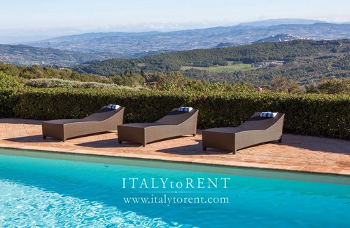 Umbria, holiday villa for rentals, private garden and large pool, total privacy, panoramic views. Air conditioning, wifi inside and out. Excellent restaurant at waking distance; Todi 15 mins drive. Sleeps up 7.