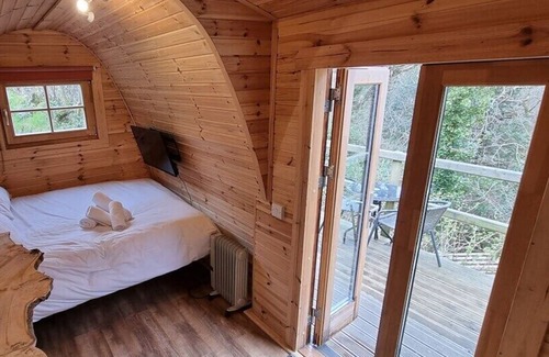 Our very special tree top Forest Nest on the edge of a woodland and RSPB reserve overlooking the Cym Mynach river. Opposite the Cader Idris mountain range in the heart of Snowdonia. Rustic charm mixed with modern convenience. Boasting a stylish shower room, great kitchen facilities a comfy double bed, TV & Wifi. Your own private hot tub overlooking the river below. Outdoor firepit/BBQ. Personal picnic area in the forest and wild swimming access make for a perfect getaway retreat. Dogs welcome.