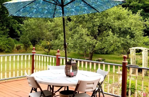 The Majestic King Suite is on the 2nd floor-very private with a French door opening to a private balcony. The 500sq. ft. room has a high vaulted ceiling, hard wood floors, a king size bed with a luxury mattress, an electric fireplace, an A/C window unit. En suite bathroom has double vanity, separate shower stall and a 2-person jacuzzi tub. The outdoors have beautifully landscaped gardens with multiple sitting areas on the bank of a mountainous babbling creek.