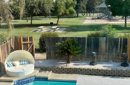 Four bedroom three bathroom home recently renovated outdoor patio by the pool perfect for barbecue with the family or friends you have access to the entire house and also there is a back door by the pool where you could enter the park located right next-door for any events in the park must check in with the city of Bakersfield for information Washer and dryer available as well