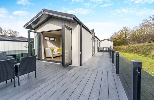 Pull up in the parking area, where you have two spaces available, and walk 20 metres to your single-storey lodge. Three steps up take you through the gate to the raised terrace and the front door. Inside, you’ll find a lounge on your left, with comfortable sofas and a Smart TV – a welcoming space in which to relax, perhaps streaming a box set, after a day’s adventures. Continue to the chic kitchen, where you’ll have everything you need to create delicious holiday snacks and meals, including a microwave. There’s also seating for four at a stylish dining table. The two bedrooms, a double and a twin, are at the back of the lodge, both clever styling. They share a modern family shower room.