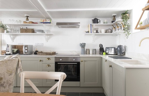 Recently refurbished and elegantly updated, this lovely home offers a bright and inviting space, with a combination of coast-inspired décor and authentic features, that create a chic and relaxing atmosphere throughout. Arranged over three floors, two lovely bedrooms can be found upstairs with a gorgeous master bedroom on the first floor and a sumptuous twin room on the upper. Both rooms have crisp, high quality linen and feature large sash windows; perfect for taking in the sweeping oceanscape views and enjoying the ever-changing moods of the sky. Downstairs, the delightful living area in calming, neutral tones is open-plan with the well-designed kitchen, and has an inviting sofa and two occasional chairs arranged cosily around a fabulous wood-burning stove.