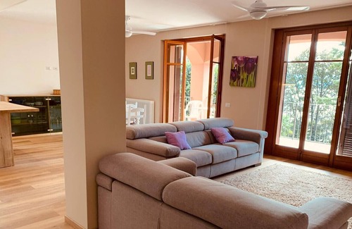 Martin apartment is on the first floor of a building in the upper part of the Pascià residential complex in Oggebbio. The newly renovated flat has an elegant and bright living room with TV, two sofas, a dining table for 6 persons, and a modern open-plan kitchen with all appliances. The living room and kitchen have ceiling fans. From the living room there is access to the terrace furnished with table and chairs for outdoor dining. From here there is a partial lake view. Martin has two bedrooms, one with a double bed and one with two single beds. The modern bathroom has washing machine and a large, elegant shower. The Martin flat is distinguished by the elegance of its furnishings. Parking spaces are available for guests under the house. The Pascià residence offers guests, amidst beautiful flower gardens, a comfortable 18 x 8 m swimming pool (open from 15.06 to 03.09), a children's pool, a playground, tennis courts and a private beach with direct access to the lake.