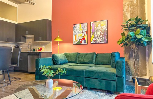 Designed with the traveler in mind, this two bedroom Suite (Sleeps 8) caters all your needs in a modern, spacious layout with metropolitan decor that gives this suite a sophisticated edge. The Michigan Suites are thriving with downtown vibes. This suite offers guests a modern space with custom comforts that are a cut above the usual VRBO experience. Each room is uniquely designed to its own stylish accents and convenient amenities to give you the perfect mixture of home and away. At the premium status level, our suite provides you with a premiere experience in a premiere city.