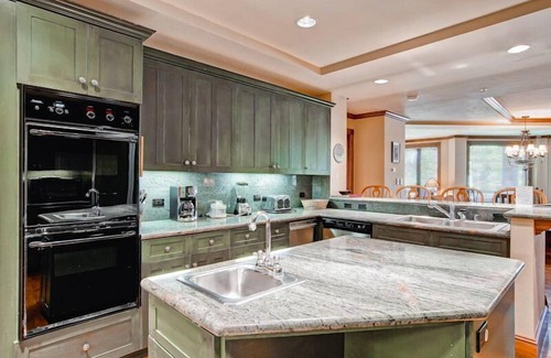 This slopeside, Platinum, first floor residence offers a wood burning fireplace, a chef’s kitchen with double ovens, four guest suites, each with an attached bathroom, two with king size beds, the third with two twin size beds, and the fourth is a true bunk room with two sets of twin-over-twin bunk beds, two additional twin beds and a trundle bed (sleeps 7). Additional features include a game room, minibar area, washer/dryer, underground parking for one vehicle and easy access to the slopes from the private ski locker room.
