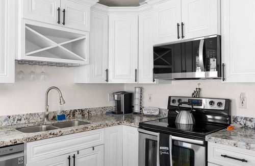 Around the corner is a lovely open and modern kitchen. The cook in the group will enjoy whipping up home-cooked meals with stainless steel appliances and plenty of counter space. Prefer to dine alfresco? There is a mini fridge and built-in BBQ outside it's the perfect spot to prepare and grill some burgers for the crew.
